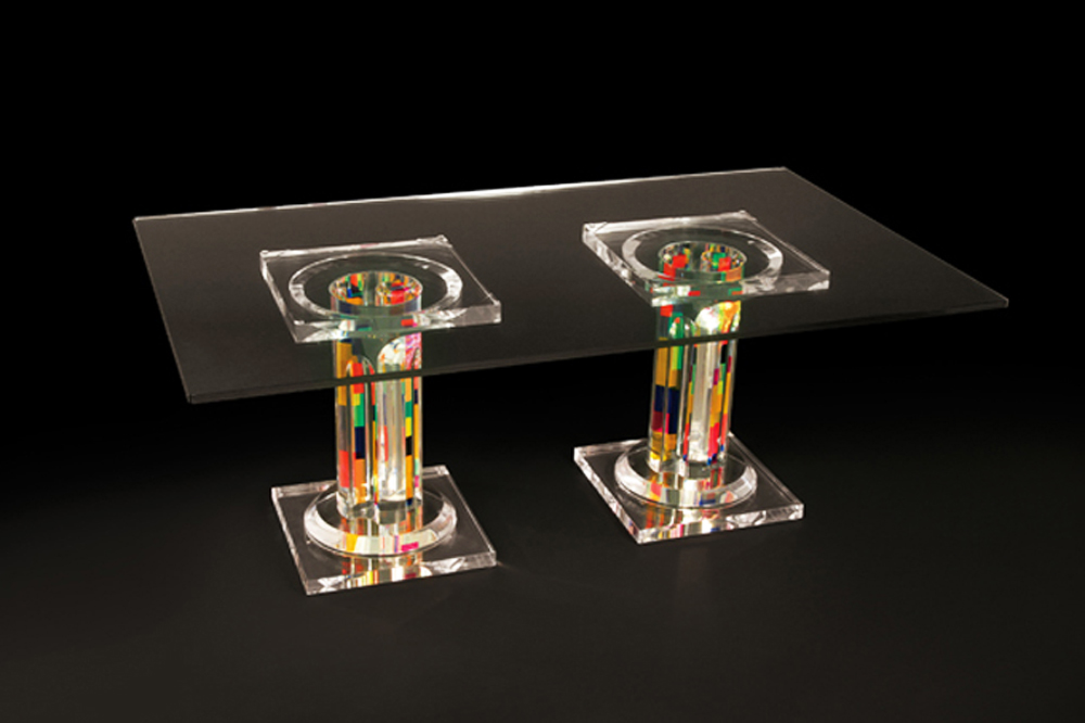 Les tables basses en plexiglass ‘Columna de la Cruz’ prèsentent des colonnes faites avec des bloques de plexiglas transparent avec des pièces de plexiglass coloré à l’interieur. Cela donne un effet de légèreté à la structure qui vient projectée vers le haut, avec un sentiment qui pourrait être défini comme post-gothique.